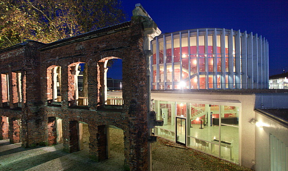 ![]() Stadttheater Münster, den ersten Theaterneubau der Bundesrepublik. Er war ein Statement für die von den Nazis verfemte Moderne. Das Gebäude stand in scharfem Kontrast zur typisch münsterschen Bauweise jener Zeit und sprengte die Klischees der Nachkriegsarchitektur. So wurde es europaweit als ein "befreiender Donnerschlag" der Theaterarchitektur gefeiert. Der Vorgängerbau an derselben Stelle,das Lortzing-Theater im klassizistischen Romberger Hof, |