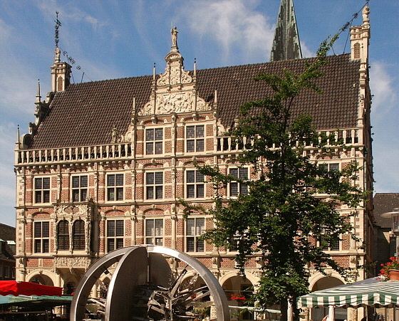 Im Jahr seiner Grundsteinlegung, 1618, brach der Dreißigjährige Krieg aus und am 22. März 1945 brannte das Historische Rathaus der Stadt beim großen Luftangriff auf Bocholt fast nieder. "Dieses Rathaus, dem an Schönheit keines gleichkommt im Vaterlande, zeigt die Großzügigkeit der Stadt", hatte im 18. Jh. ein lokalpatriotischer Scholastiker gelobt. Tatsächlich kann man noch heute am originalgetreu rekonstruierten Nachbau einen Renaissance-Stil von seltener Feinheit und Reinheit bewundern. Über den Baumeister des 17. Jhs ist nichts bekannt, doch er muss, das zeigt | der Architekturvergleich, aus den Niederlanden gekommen sein. Typisch für die Region der Backstein und der Baumberger Sandstein. Die prachtvolle Schauseite steht quer zum Markt, der Zwerchgiebel in der Mitte zeigt den Stadtpatron, den hl. Georg, im Kampf mit dem Drachen. In der ersten Etage links das einzige nicht symmetrisch gesetzte Element, ein Ziererker mit dem Bocholter Wappen, dessen Fenster der Stadt die Haupttugenden präsentiert: Klugheit, Gerechtigkeit, Mäßigkeit und Tapferkeit. | |