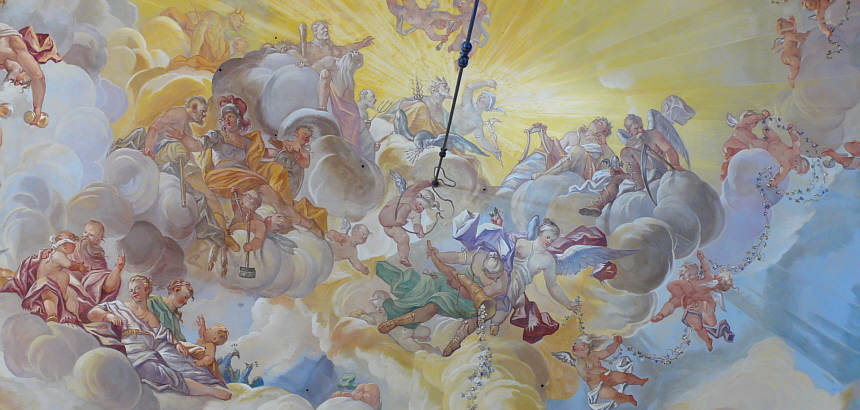 | Erbdrostenhof | Münster Das kosmologische Skulpturenprogramm der Fassade des Erbdrostenhofs (vermutlich von Johann Christoph Manskirch) findet im Bildprogramm des Festsaals seine Fortsetzung. An den Seiten die gemalten Statuen der Tugenden des guten Fürsten: Eintracht, Liebe, Hoffnung, Tapferkeit, Freigebigkeit, Milde und Friedfertigkeit. Putten vertreten die Künste der Architektur, Poesie, Skulptur und Malerei, in denen der ideale Herrscher dilettierte. An der Decke öffnet sich der antike Götterhimmel mit Jupiter und Merkur, Apollo und Saturn in der Mitte. In ihn wird aufgenommen, wer gerecht geherrscht und vorbildlich gelebt hat. Die im Zweiten Weltkrieg zerstörten Fresken von Nikolas Loder wurden 1965–67 von Paul Reckendorfer wieder hergestellt. In Kooperation mit dem Landschaftsverband Westfalen-Lippe
