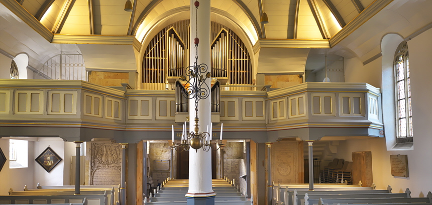 Der barocke Turm der Ev. Stadtkirche, Wahrzeichen Tecklenburgs, überragt die mittelalterlichen Fachwerkhäuser des Ortskerns. Die Kirche wurde 1562-66 errichtet, nachdem Konrad von Tecklenburg die Reformation eingeführt hatte. Das Kirchenschiff mit dem schönen Holztonnengewölbe, das eine Eichensäule in der Mitte wie ein mächtiger Paradiesesbaum stützt, stammt ebenso wie der Turm aus dem 18. Jahrhundert.