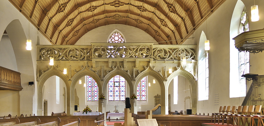 eines der ältesten seiner Art, und die Empore. Bemerkenswert der Lettner