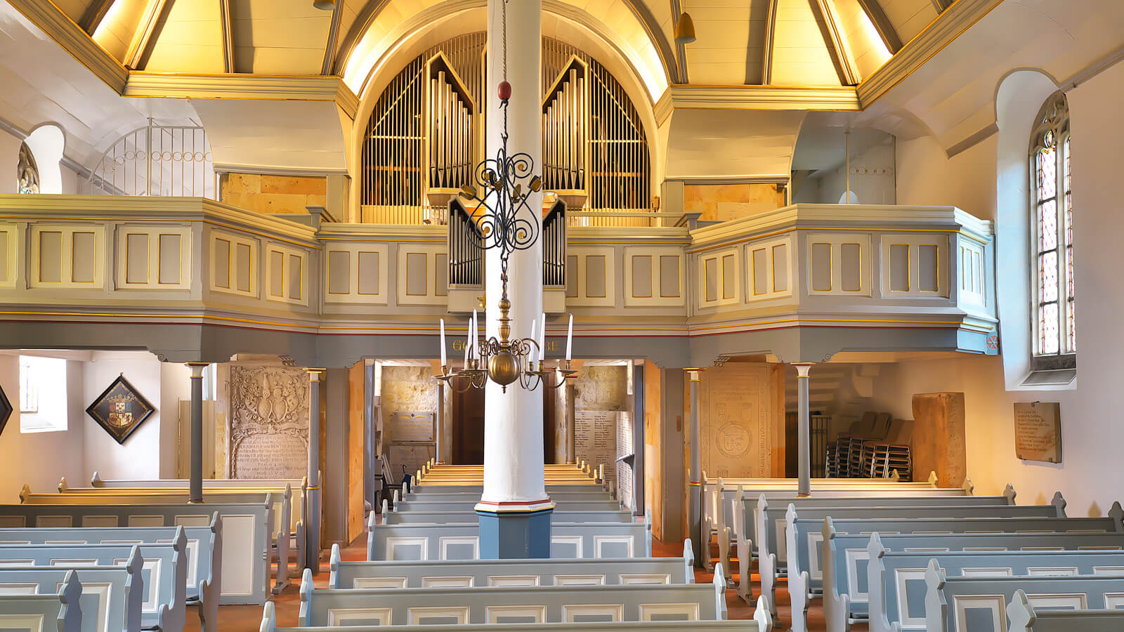 Der barocke Turm der Evangelischen Stadtkirche, Wahrzeichen Tecklenburgs, überragt die mittelalterlichen Fachwerkhäuser des Ortskerns. Die Kirche wurde 1562-66 hoch auf dem Berg errichtet, nachdem Konrad von Tecklenburg die Reformation eingeführt hatte. Das Kirchenschiff mit dem schönen, zentrierten Holztonnengewölbe und den in lichten Farben gefassten Gestühl stammt, ebenso wie der Turm, aus dem 18. Jahrhundert.