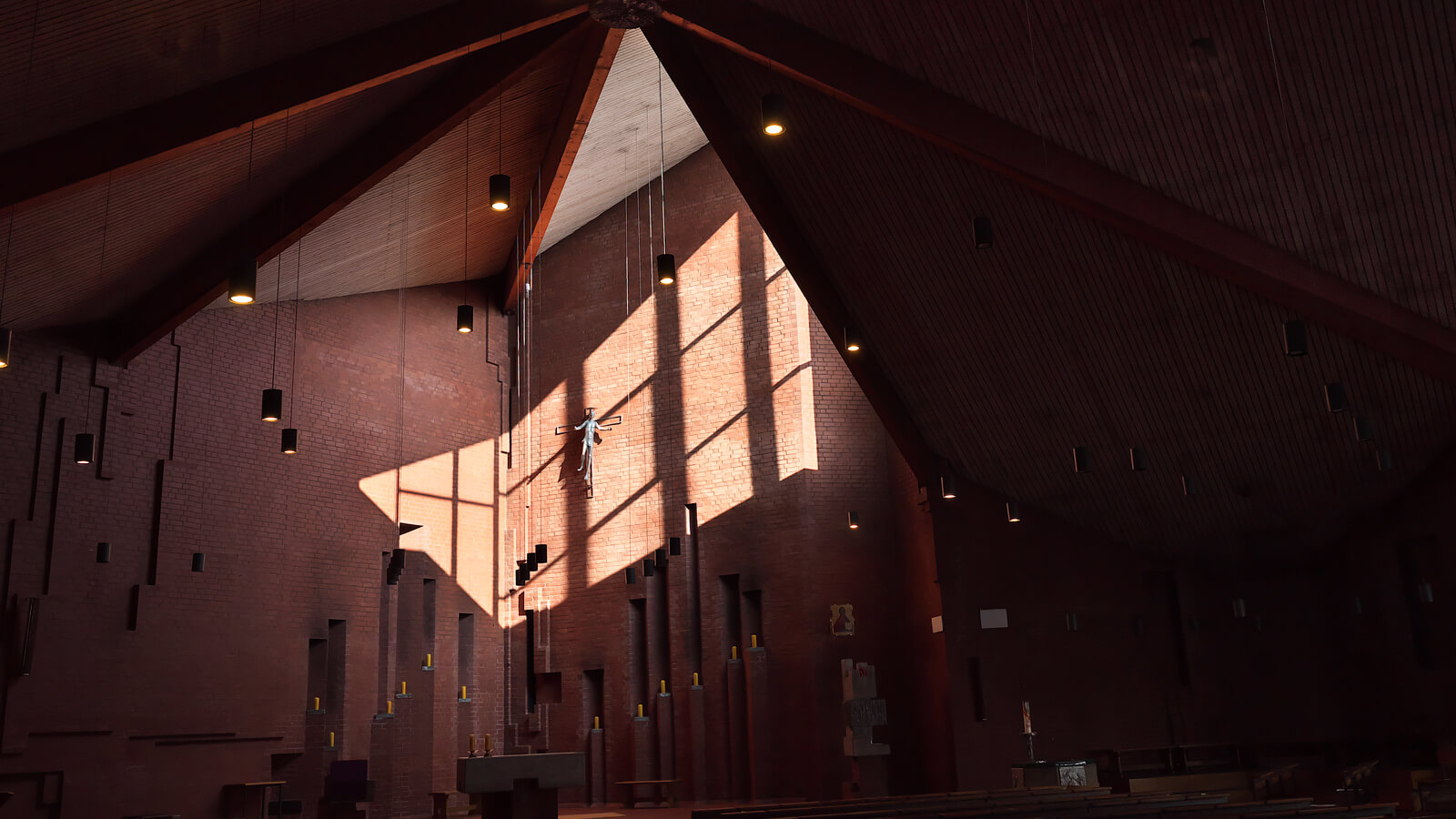 Die Kirche St. Michael, 1970 geweiht, ist der erste Sakralbau des Architekten Harald Deilmann. Zwei Quadratblöcke, gegeneinander verschoben, bilden den Kirchenraum, der asymmetrisch ist. Das zeltartige Dach ist holzvertäfelt, die Wände sind rot verklinkert mit Backsteinreliefs, durch verglaste Wandpartien fällt Licht in den Altarraum und auf das sehr hoch an der Wand hängende Kreuz, von der gegenüberliegenden Seite aus in den hinteren Kirchenraum. Die Glasfenster mit den vierzehn Stationen des Kreuzwegs schuf Tisa von der Schulenburg.